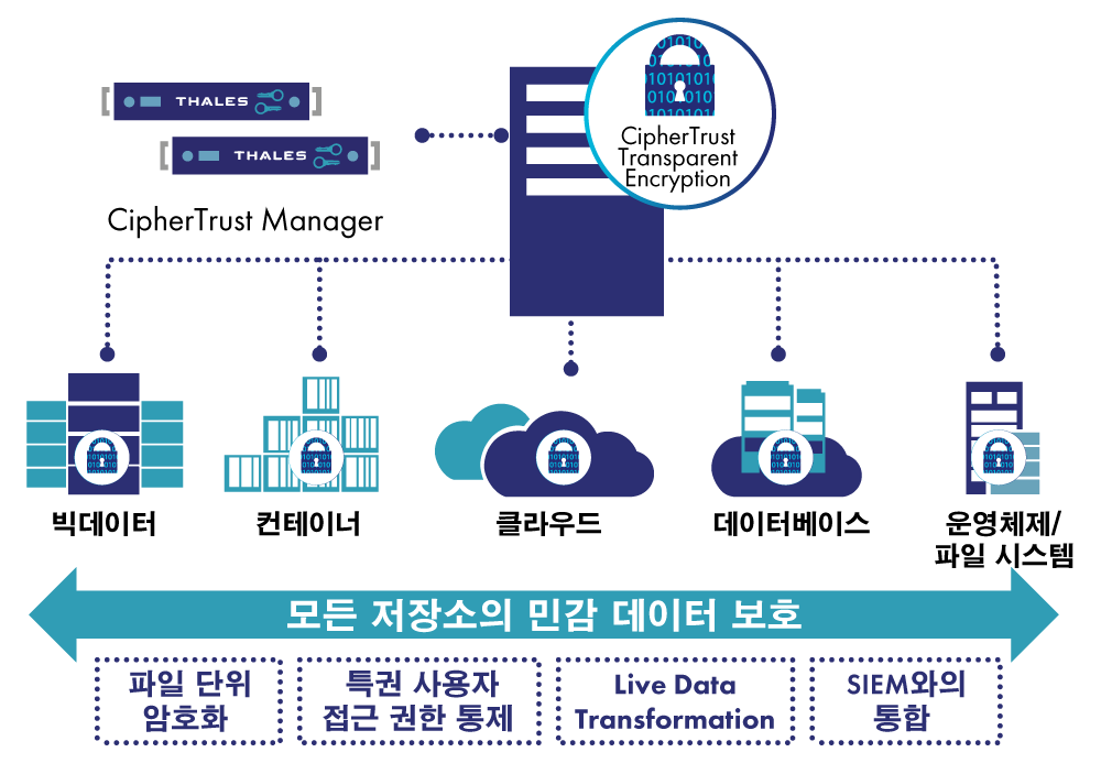 CipherTrust Åõ¸í ¾ÏÈ£È(ÀÌÀü Vormetric CipherTrust Åõ¸í ¾ÏÈ£È)´Â Áß¾Ó ÁýÁß½Ä Å° °ü¸®, ±ÇÇÑ »ç¿ëÀÚ ¾×¼¼½º Á¦¾î, »ó¼¼ÇÑ µ¥ÀÌÅÍ ¾×¼¼½º °¨»ç ·Î±ëÀ» ÅëÇØ ÀúÀå µ¥ÀÌÅÍ ¾Ïȣȸ¦ Á¦°øÇÕ´Ï´Ù. À̸¦ ÅëÇØ ¿ÂÇÁ·¹¹Ì½º ȯ°æÀ̳ª ¸ÖƼ Ŭ¶ó¿ìµå ȯ°æ, ºòµ¥ÀÌÅÍ ¹× ÄÁÅ×ÀÌ³Ê È¯°æ µî µ¥ÀÌÅÍ À§Ä¡°¡ ¾îµðµçÁö º¸È£ÇÒ ¼ö ÀÖ½À´Ï´Ù.