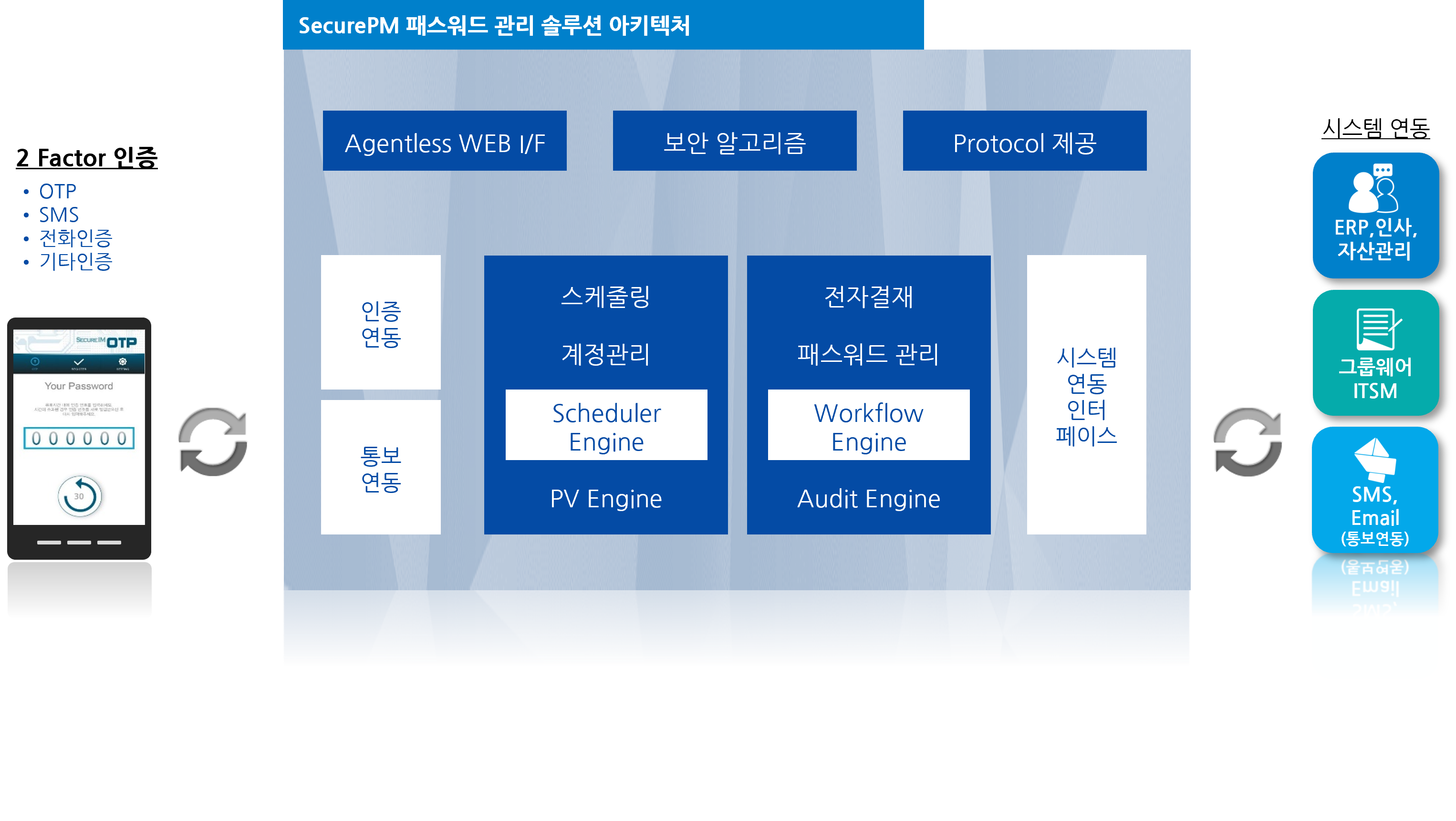 Secure PMÀº ÆÐ½º¿öµå °ü¸®¸¦ À§ÇÑ ¿£Áø°ú °¢Á¾ ¿¬µ¿ ÀÎÅÍÆäÀ̽º, ±×¸®°í PC¿¡ º°µµÀÇ ÇÁ·Î±×·¥ ¼³Ä¡°¡ ÇÊ¿ä ¾ø´Â À¥ »ç¿ëÀÚ ÀÎÅÍÆäÀ̽º µîÀ¸·Î ±¸¼ºµÇ¾î ÀÖ½À´Ï´Ù. 2 Factor ÀÎÁõ°ú °¢Á¾ Á¤º¸ ½Ã½ºÅÛÀ» ¿¬°èÇÒ ¼ö ÀÖ´Â È®À强À» Á¦°øÇÕ´Ï´Ù.