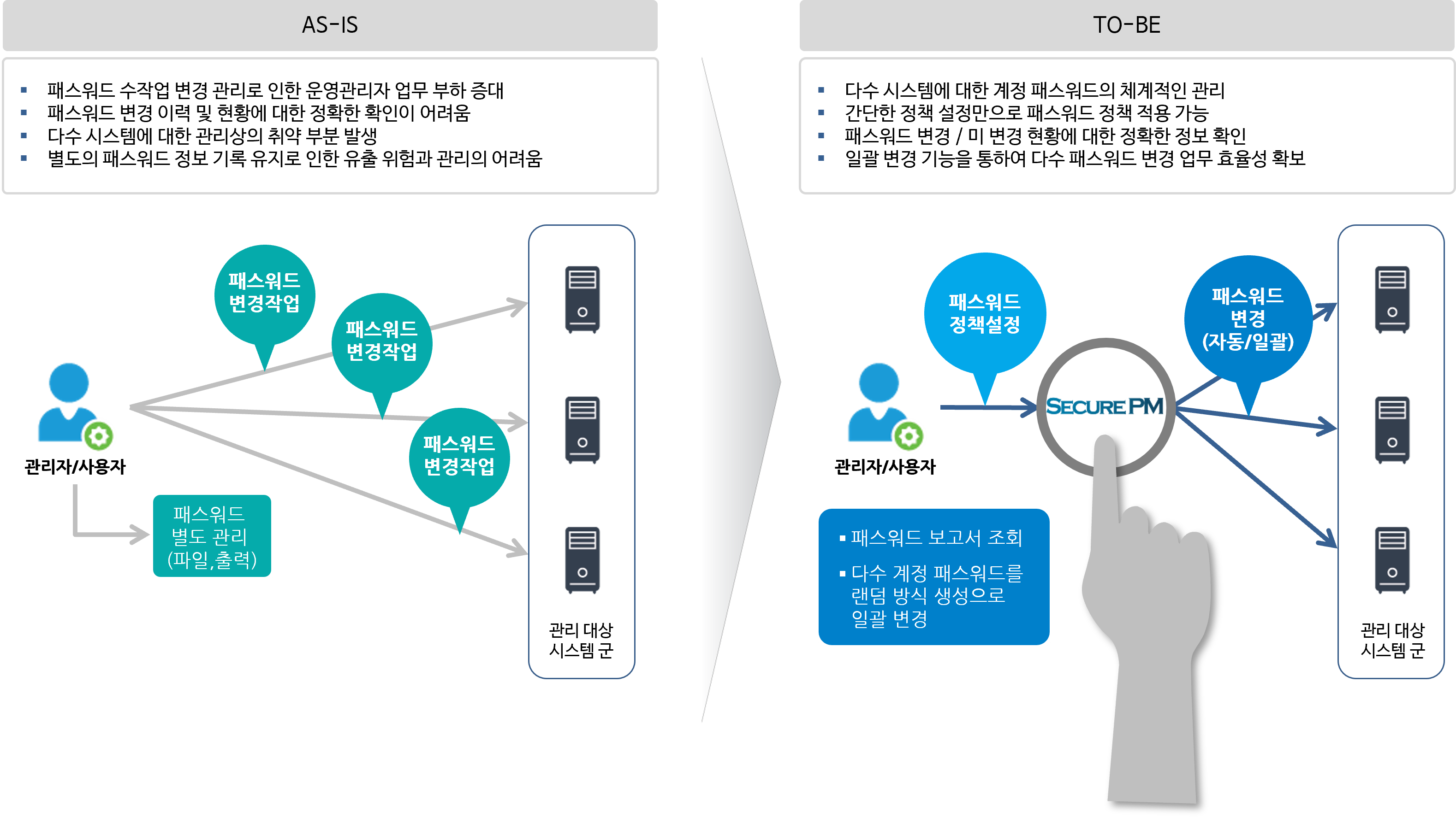 µµÀÔ Àü¿¡´Â °¢ ½Ã½ºÅÛ º°·Î °ü¸®ÀÚ¿¡ ÀÇÇÏ¿© ÆÐ½º¿öµå º¯°æ°ú °ü·Ã ÀÛ¾÷À» ¼öÇàÇÏ¿©¾ß ÇßÀ¸³ª, Secure PM µµÀÔ ÈÄ¿¡´Â À¥ ÀÎÅÍÆäÀ̽º¸¦ ÅëÇÏ¿© ½±°Ô ÆÐ½º¿öµå Á¤Ã¥ °ü¸® ¹× ÀÚµ¿/Àϰý º¯°æ ÀÛ¾÷À» ¼öÇàÇÒ ¼ö ÀÖ½À´Ï´Ù.