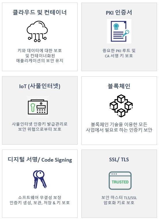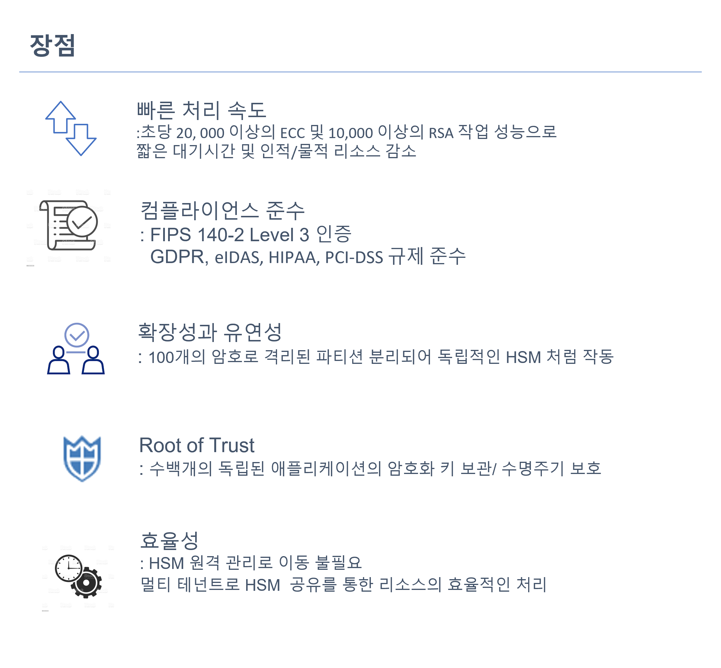 ³×Æ®¿öÅ© ¿¬°áÇü HSMÀ» ±¤¹üÀ§ÇÑ ¾ÖÇø®ÄÉÀ̼ǿ¡ °£ÆíÇÏ°Ô ÅëÇÕÇÏ¸é ¾ÏÈ£È ÀÛ¾÷ ¼Óµµ¸¦ ³ôÀ̰í, ¾ÏÈ£È Å° ¼ö¸í Áֱ⸦ º¸È£Çϸç, Àüü ¾ÏÈ£È ÀÎÇÁ¶ó¿¡ ´ëÇÑ RoT(Root of Trust)¸¦ Á¦°øÇÒ ¼ö ÀÖ½À´Ï´Ù.